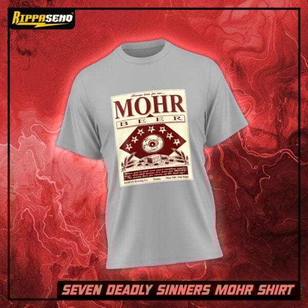 The MOHR Logo Shirt brings vintage brewery attitude straight to your wardrobe, featuring the bold, retro beer label design illustrated by Bob Hardin, the powerhouse artist behind Seven Deadly Sinners. Printed in deep red ink on a soft grey tee, the distressed halftone graphic channels old-school Americana grit with weathered type, rough textures, and a classic taproom emblem that looks like it came straight off a roadside brewery sign. It’s a timeless, high-contrast design that blends comic art edge with throwback beer culture style.