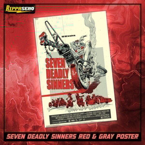 This limited-palette Red/Grey edition of Seven Deadly Sinners poster strips the world down to blood, smoke, and steel. Illustrated by Bob Hardin, the design leans hard into raw grindhouse energy: screaming tires, roaring engines, and seven killers riding straight toward the chaos. Every harsh shadow and halftone texture feels ripped from an outlaw pulp poster you’d find stapled to a telephone pole at midnight.