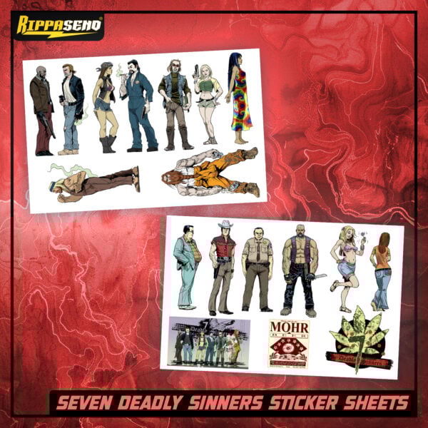 The Seven Deadly Sinners sticker sheets include two sheets of bold, high-impact character graphics pulled straight from the brutal, grindhouse world of the series. Each design captures the raw attitude, scars, and outlaw energy of the crew, printed in sharp detail with gritty colors that pop whether they’re on your laptop, sketchbook, water bottle, or convention haul.