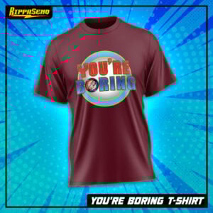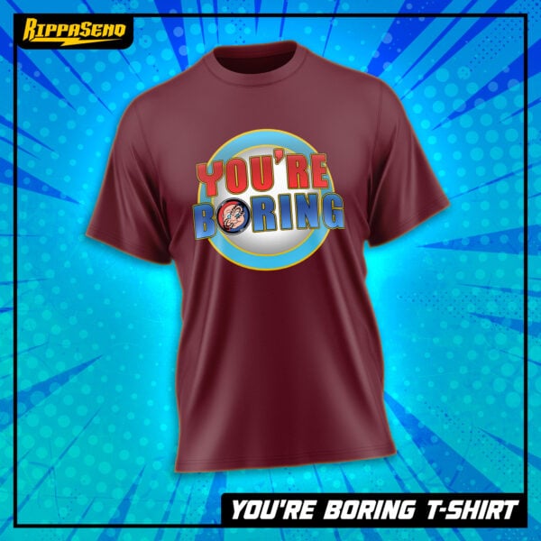 Make a bold (and hilarious) statement with the “YOU’RE BORING” shirt! This design flips a classic retro vibe into a playful jab that’s impossible to ignore. With its vibrant red and blue lettering, crisp outlines, and cheeky character detail in the “O,” this shirt is equal parts nostalgic and tongue-in-cheek. Whether you’re at a con, hanging out with friends, or just want to drop a visual mic-drop, this design has you covered.